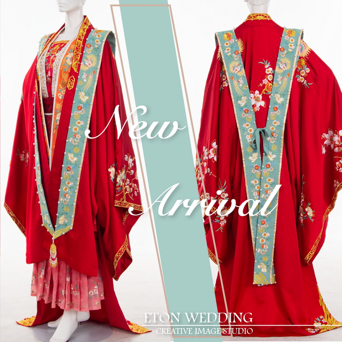 這兩款漢服婚紗乍看之下有點類似,有霞披跟馬面裙,但它的外袍款式有點不同哦!