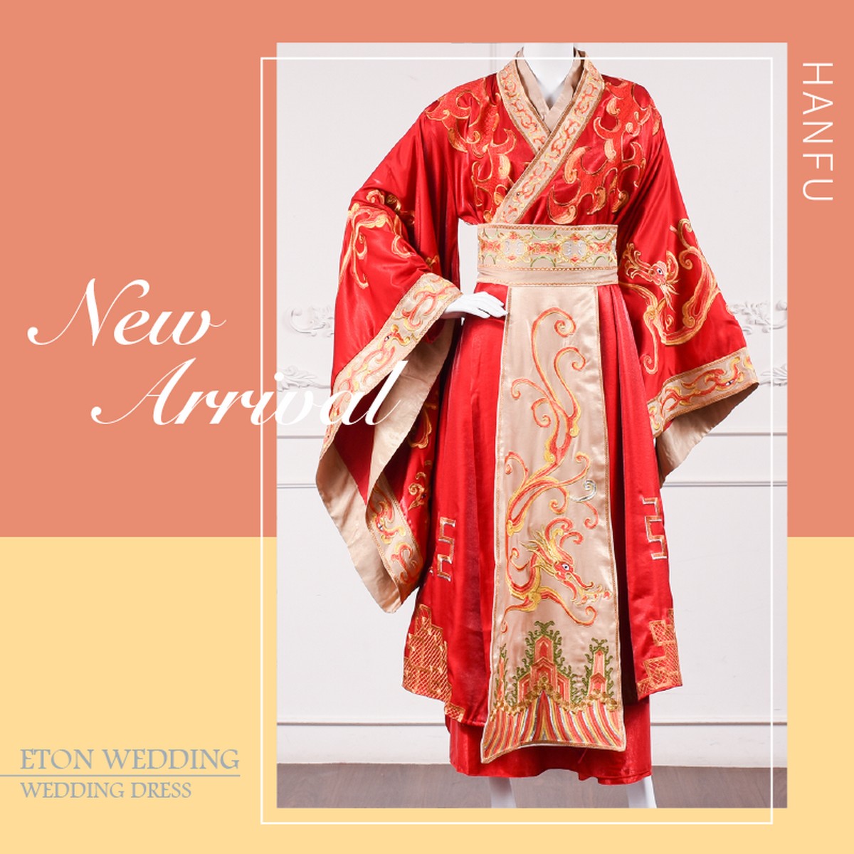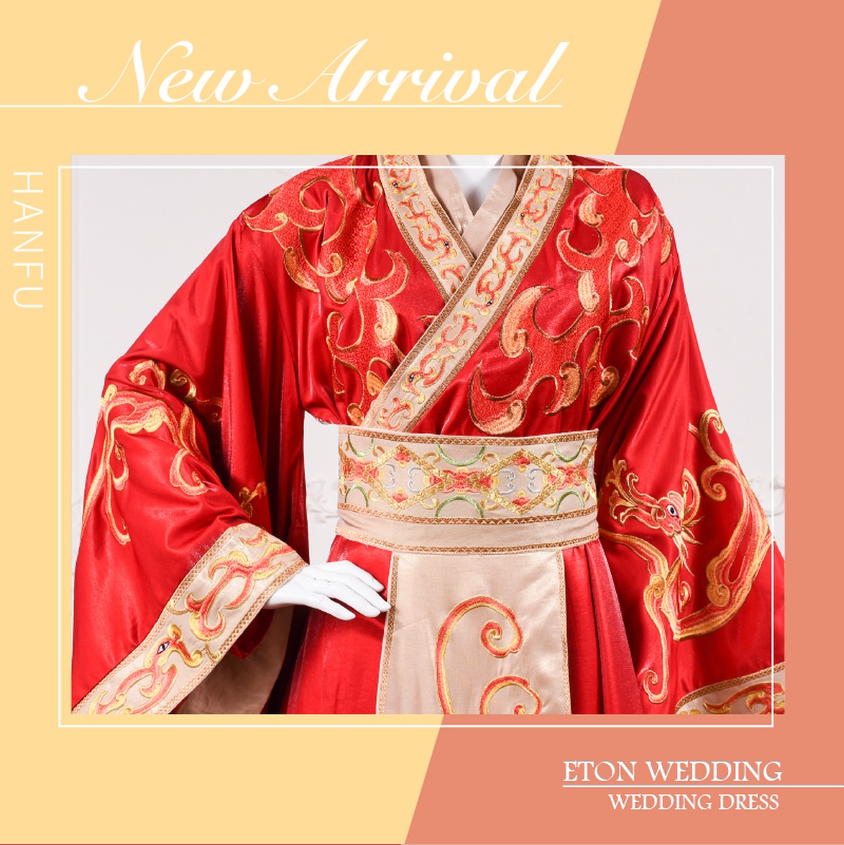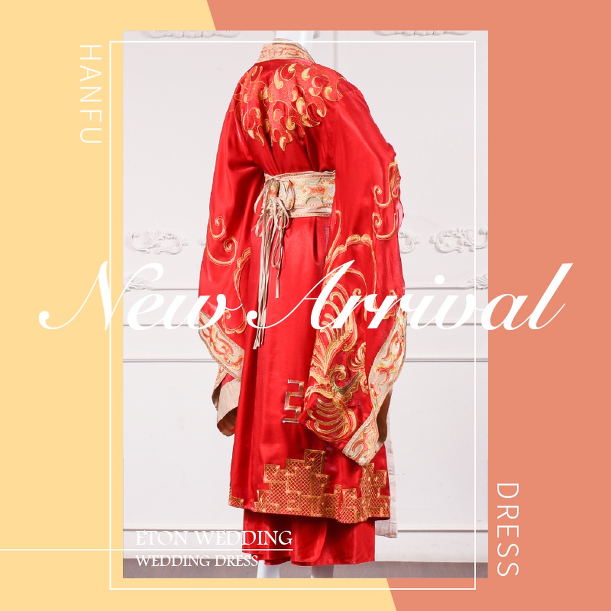這件漢服婚紗也是對襟齊腰襦裙,採用配色是金色配紅色,腰間上的束帶打造3:7的高挑身形,穿了顯得